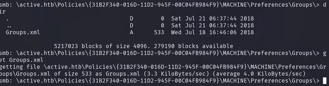 Opening it, we see that for the user “active.htb\SVC_TGS” there’s a password hash that we need to crack using gpp-decrypt.